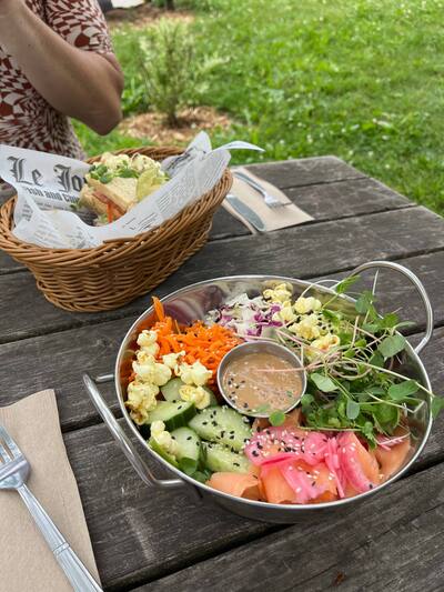 Val-David marque le point culminant de cette sortie à vélo, alors profitez-en pour vous arrêter un peu plus longtemps. À l’heure du lunch, ce café situé le long du parc linéaire propose une délicieuse sélection de sandwichs, de bols et de salades, incluant plusieurs options véganes et sans gluten. Par beau temps, la terrasse de l’établissement sera votre repaire de prédilection.