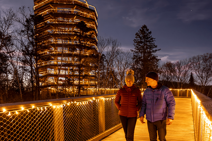 En journée, la balade offre une marche paisible en hauteur, jusqu’à une tour panoramique de 40 m qui domine les Laurentides.