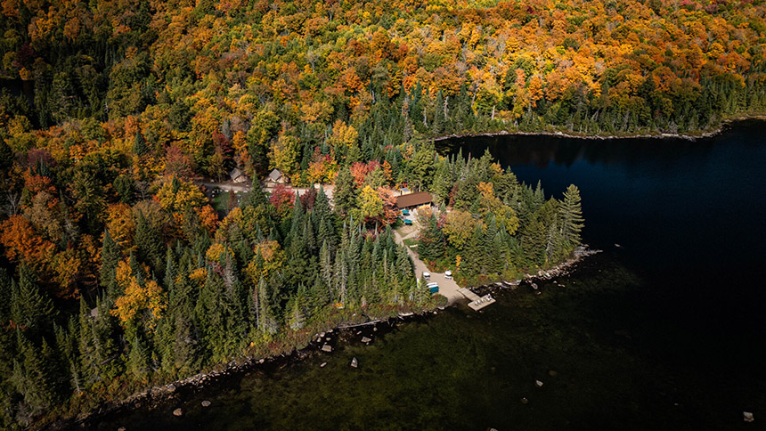 Bordé de deux lacs paisibles, le nouveau camping Huttopia se trouve au cœur du parc Éco-Laurentides, qui compte plus de 30 km de sentiers de randonnée.